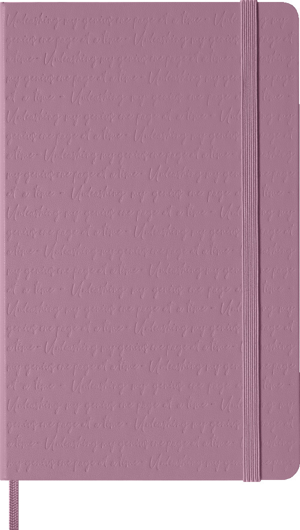 Ton-in-Ton über den Einband geprägt, erinnert der Satz „Unleashing my genius one page at a time“ daran, das eigene Genie Seite für Seite zu entfachen.