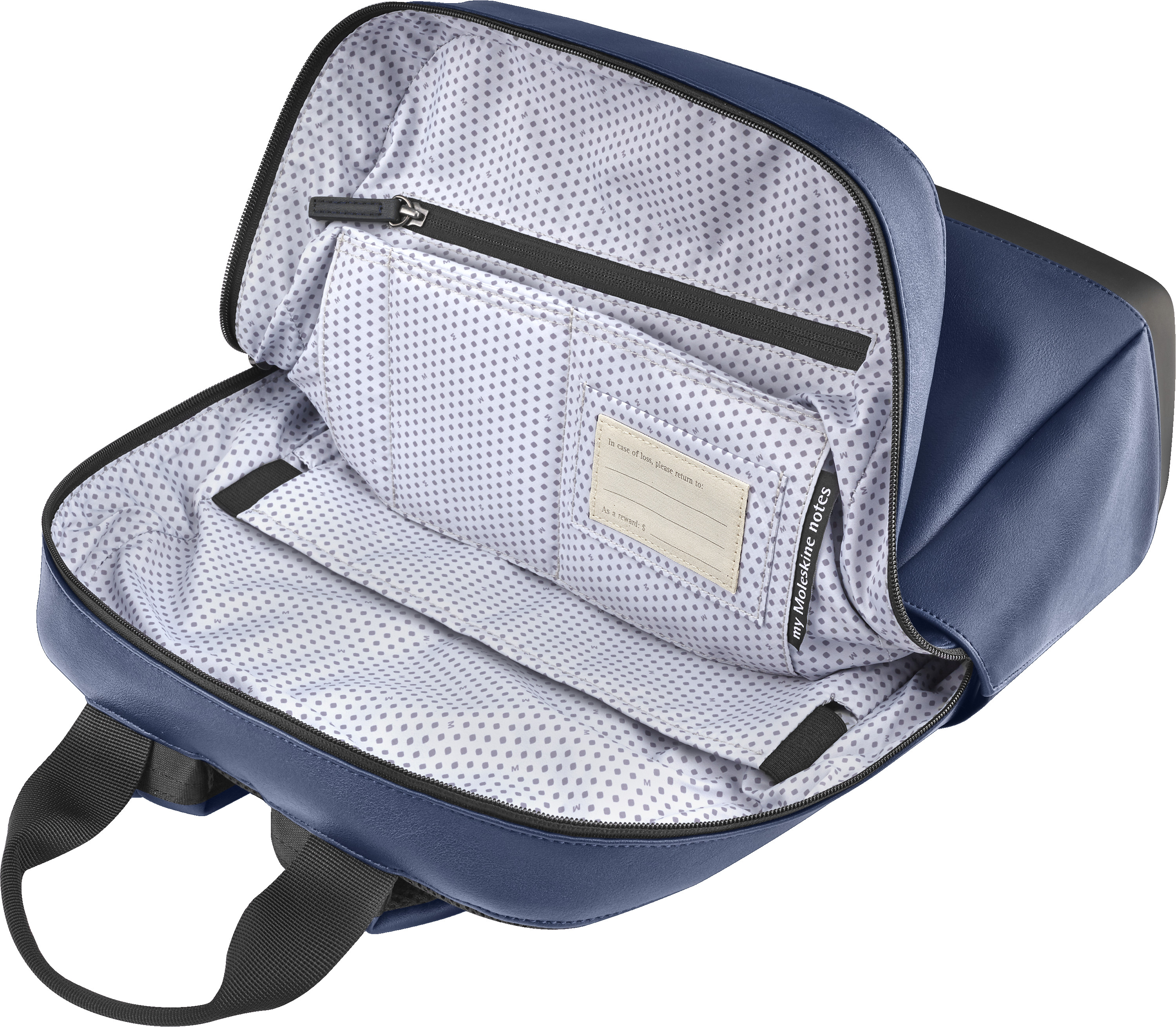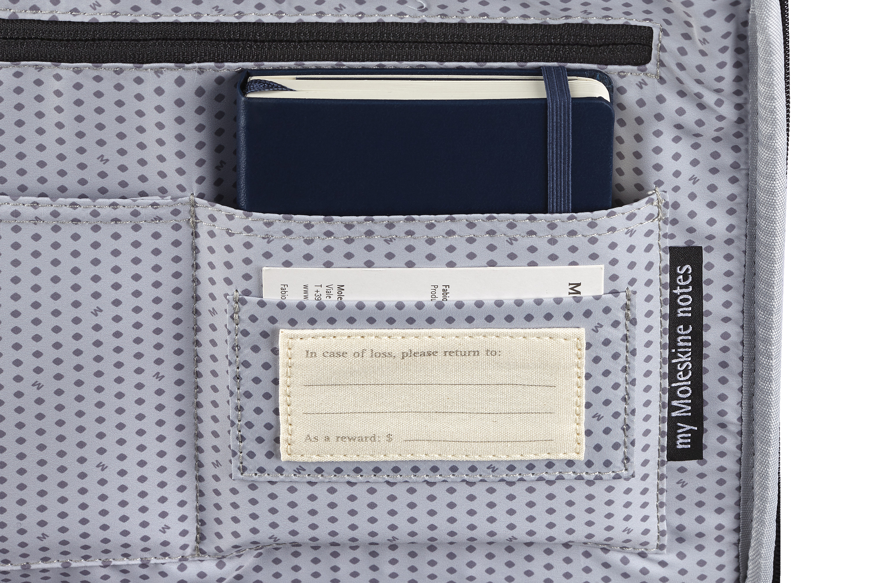 - doublure bleu azur avec motif Moleskine pour mieux voir vos affaires (100 % polyester