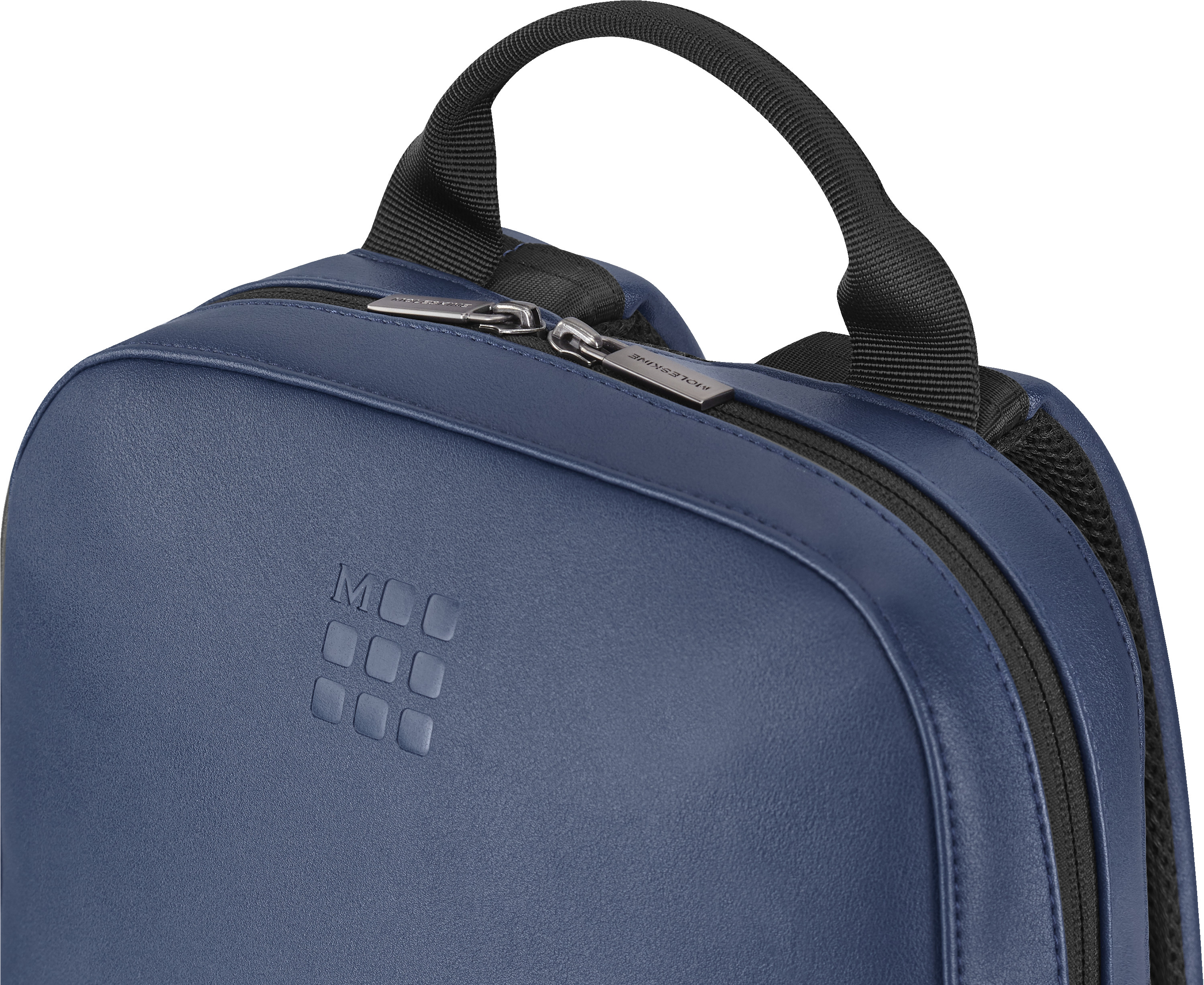 - Reissverschlüsse mit mattem Gunmetal-Finish und eingraviertem Moleskine Logo sowie geprägtem Monogramm auf der Vorderseite