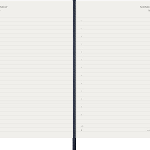 - weicher Einband mit abgerundeten Ecken, Gummiband zum Verschliessen und Lesebändchen