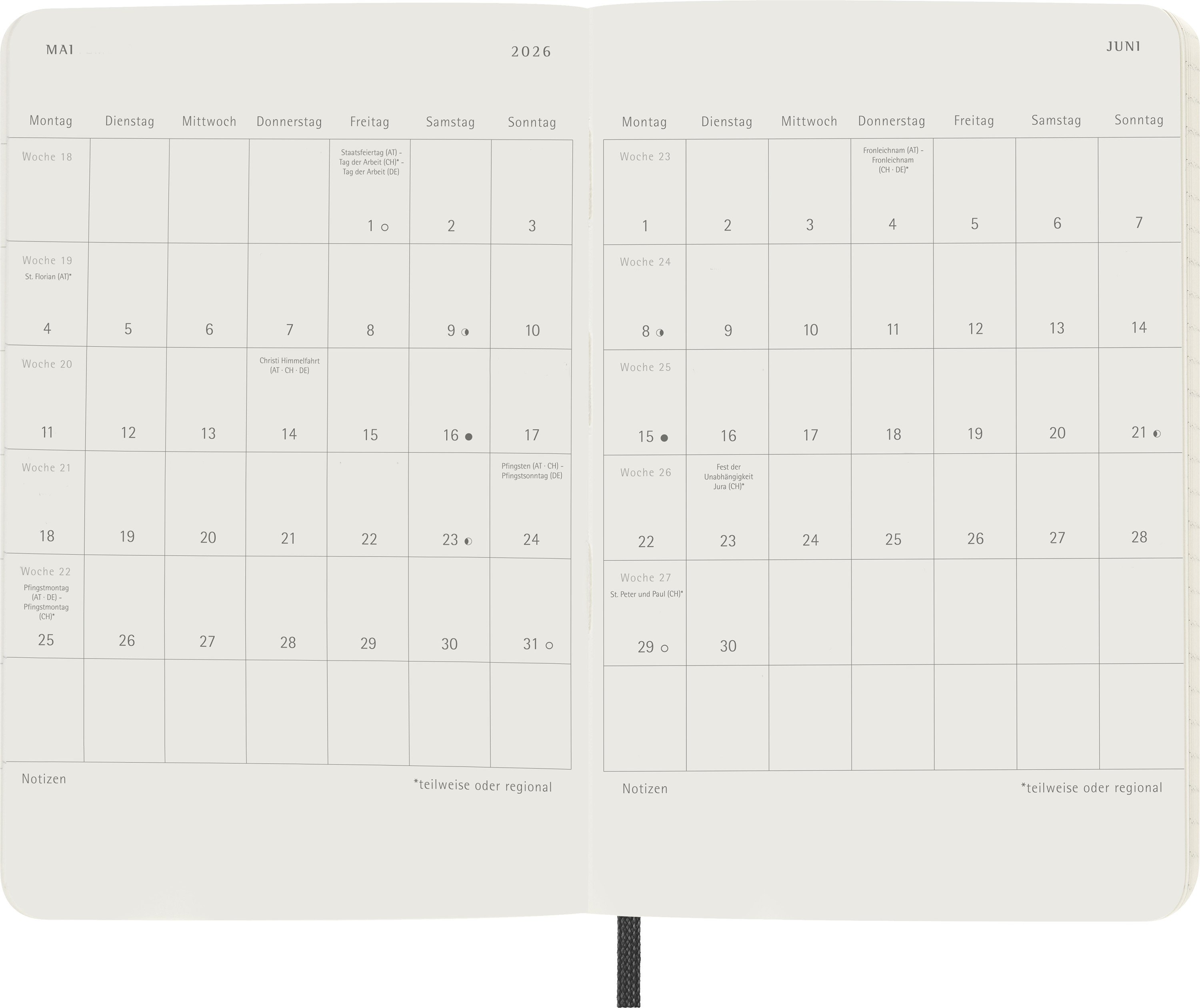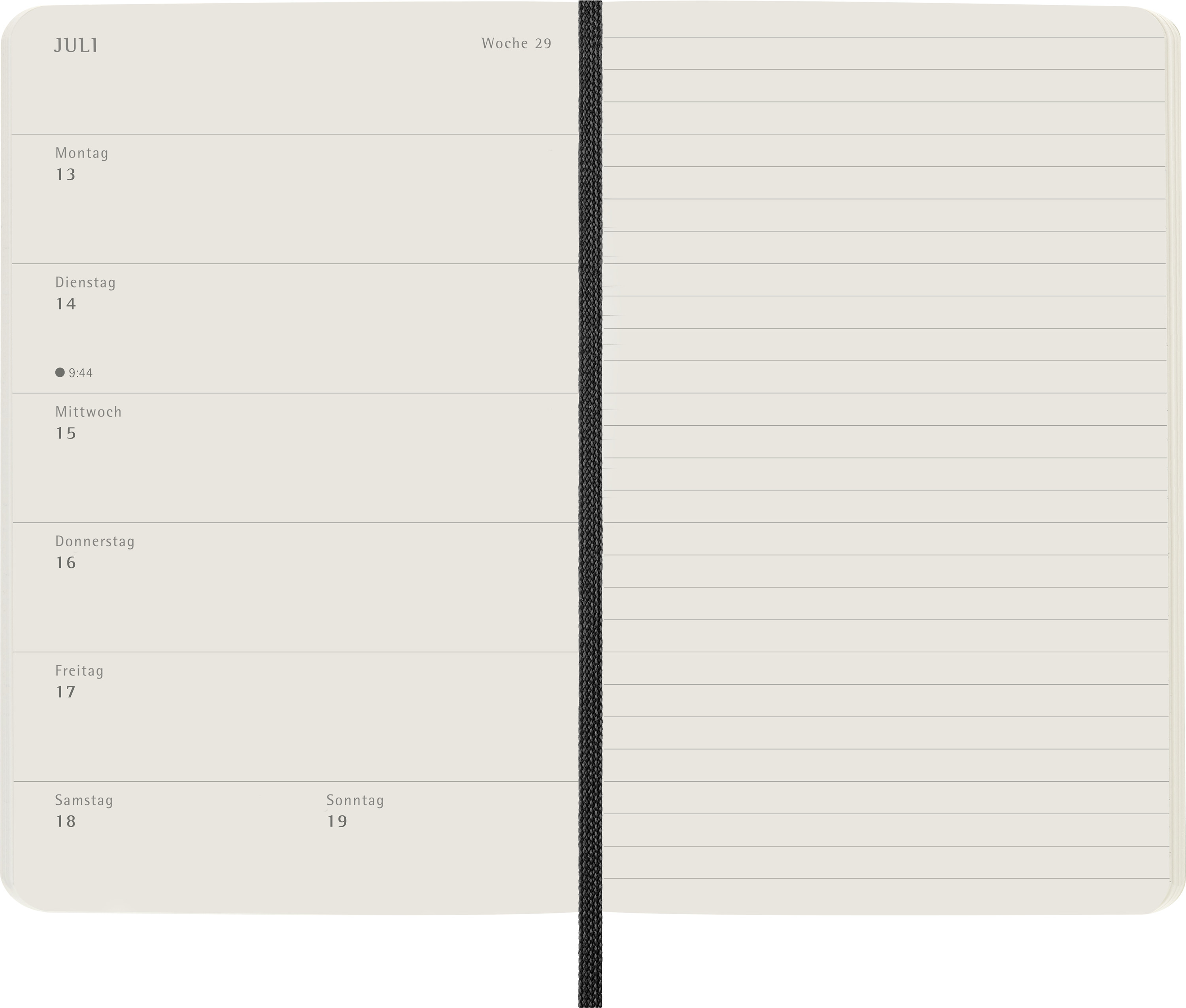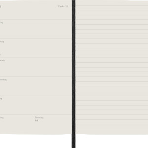 - weicher Einband mit abgerundeten Ecken, Gummiband zum Verschliessen und Lesebändchen