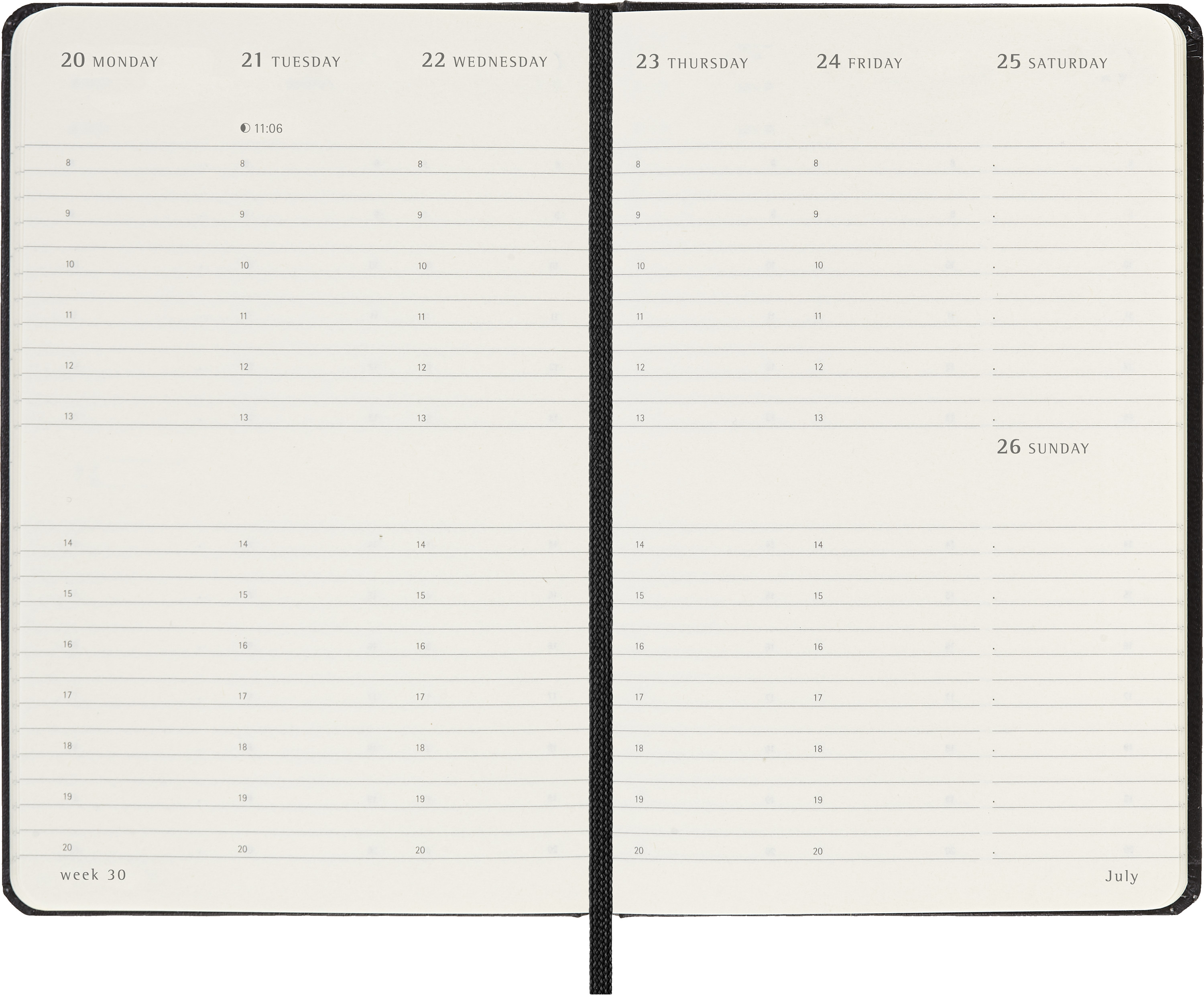 - fester Einband mit abgerundeten Ecken, Gummiband zum Verschliessen und Lesebändchen