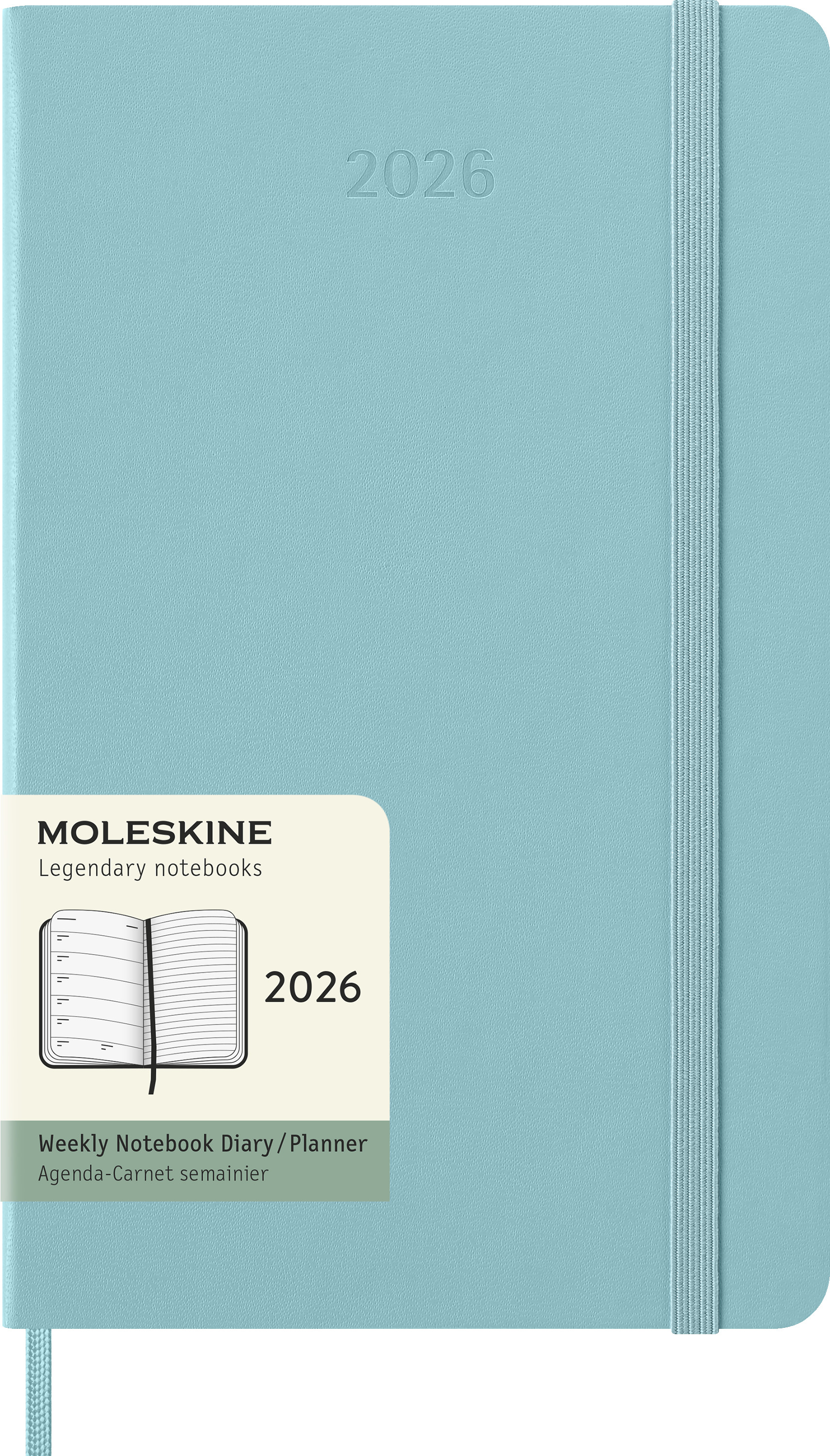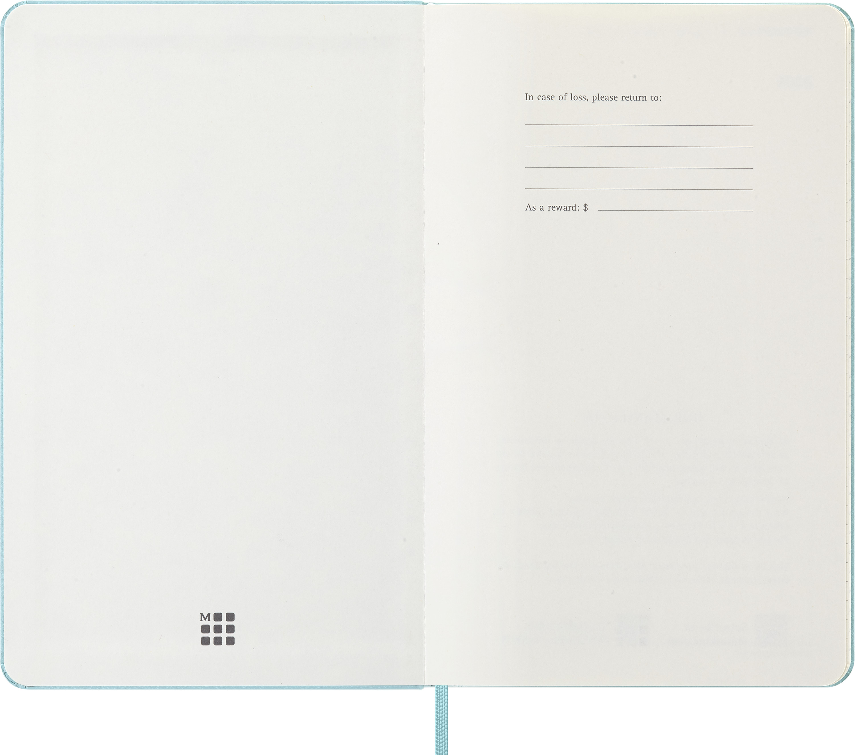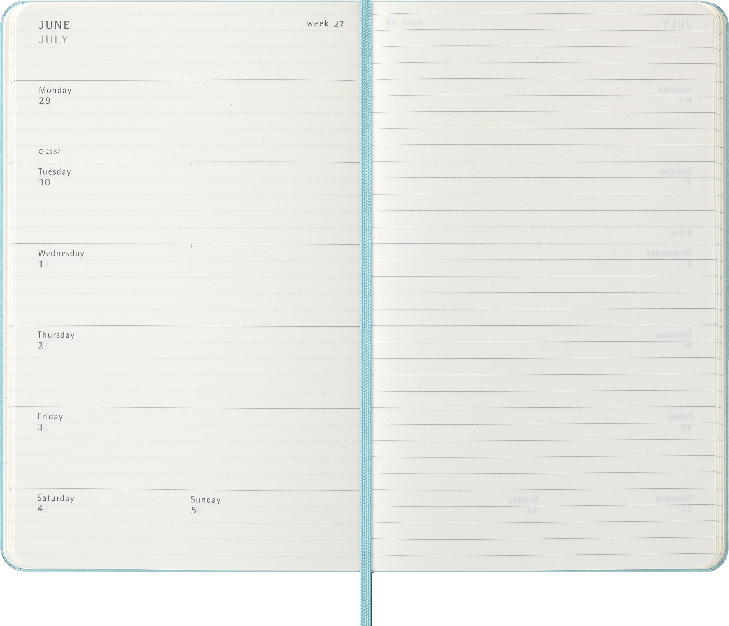 - fester Einband mit abgerundeten Ecken, Gummiband zum Verschliessen und Lesebändchen