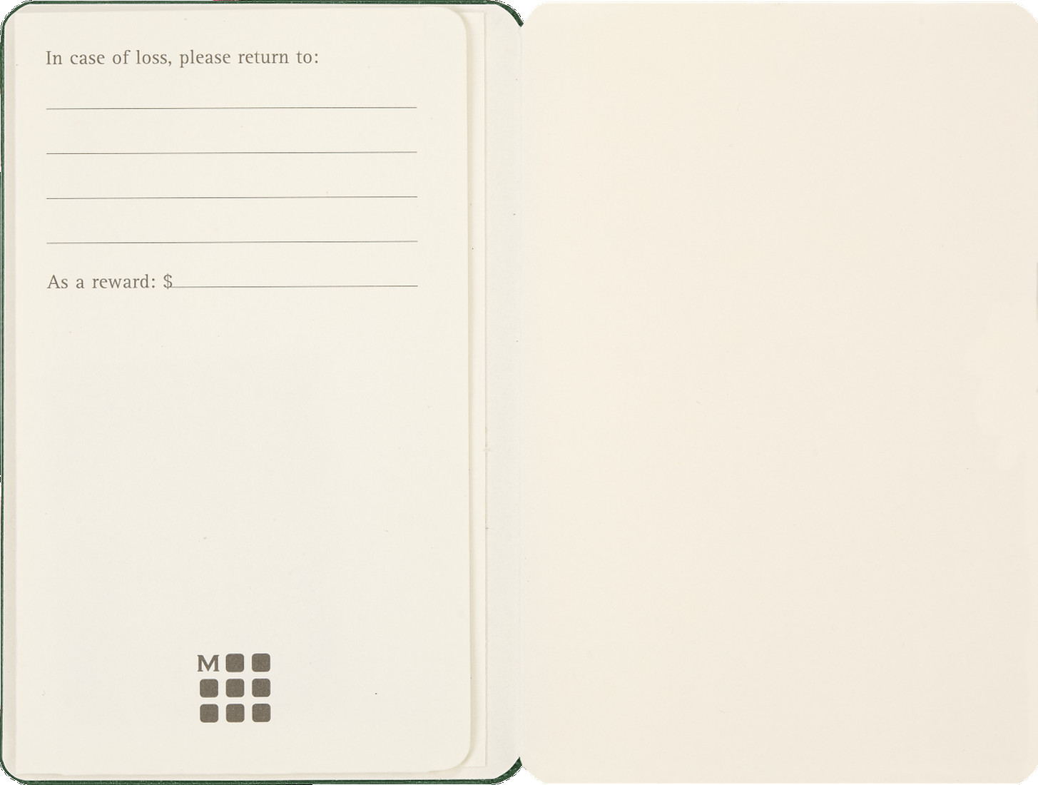 - Vorsatzblatt mit „in case of loss“ Label