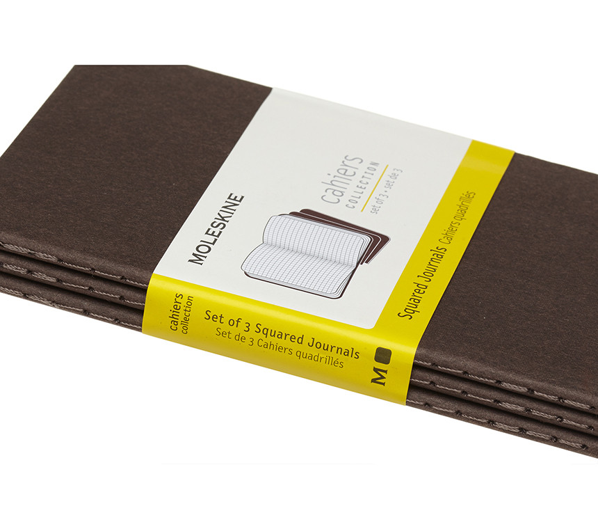 Die Notizhefte haben einen stabilen Einband aus braunem Karton mit sichtbarer Fadenheftung. Die letzten 16 Seiten sind heraustrennbar, mit einer grossen Innentasche für lose Zettel und einem Text zur Geschichte von Moleskine. Kariertes, chlorfrei gebleichtes Papier. 3er-Set
