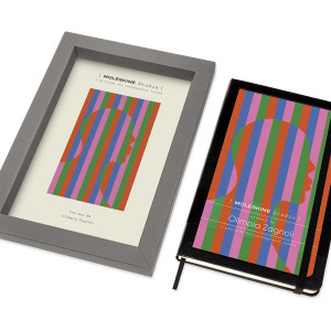 Jedes Notizbuch wird in einer hübschen Box verkauft, die den Einband des Notizbuchs ansprechend einrahmt. Die Box wurde für maximale Inspiration und minimale Verschwendung gestaltet und enthält eine Kopie des Kunstwerks hinter dem Notizbuch zusammen mit dem Namen des Künstlers und des gezeigten Werks. Dank zwei diskreter Öffnungen auf der Rückseite lässt sich die Box wie ein Bilderrahmen aufhängen.