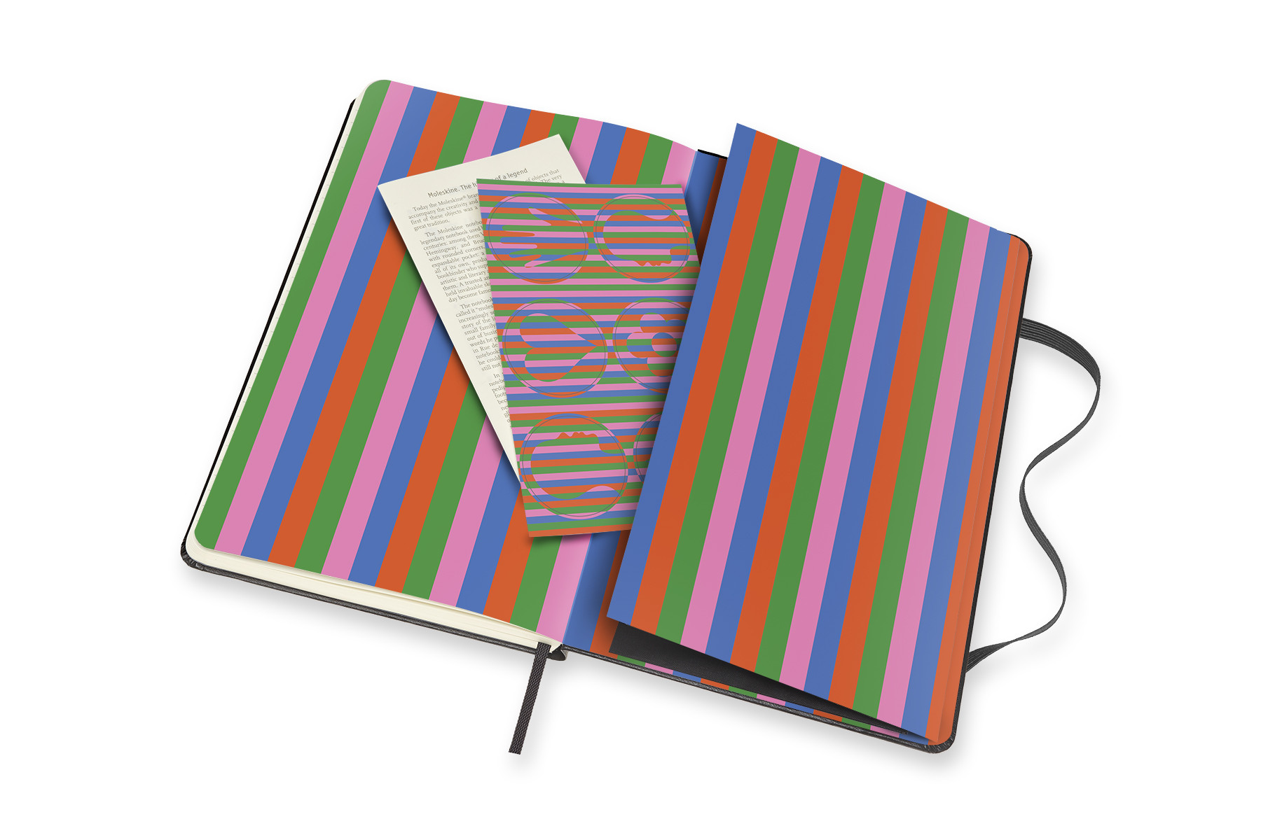 Moleskine Studio Notizbücher stellen die Werke von verschiedenen internationalen Künstlerinnen und Künstlern aus, jeweils wahlweise mit Blankoseiten oder liniert. Die Originalwerke sind nicht nur auf dem Einband zu finden, sondern auch auf den Vorsatzblättern und einem Satz Aufkleber im Inneren. Die Seiten aus 100g/m2-Papier eignen sich für eine Vielzahl von Schreib- und Zeichenstiften.