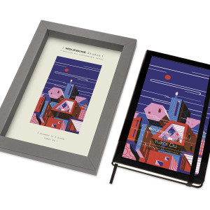 Jedes Notizbuch wird in einer hübschen Box verkauft, die den Einband des Notizbuchs ansprechend einrahmt. Die Box wurde für maximale Inspiration und minimale Verschwendung gestaltet und enthält eine Kopie des Kunstwerks hinter dem Notizbuch zusammen mit dem Namen des Künstlers und des gezeigten Werks. Dank zwei diskreter Öffnungen auf der Rückseite lässt sich die Box wie ein Bilderrahmen aufhängen.