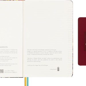 Im Inneren dieser auffälligen Geschenkbox wartet ein liniertes Limited Edition Notizbuch. Der griffige Stoffeinband des Notizbuchs zeigt eine Nahaufnahme eines Originalgemäldes von Zeng Fanzhi zur Feier des Jahres des Drachen. Neben dem vom chinesischen Neujahr inspirierten Einband enthält diese limitierte Sonderausgabe auch eine Story-Karte und glückbringende Umschläge.