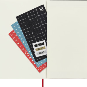 - weicher Einband mit abgerundeten Ecken, Gummiband zum Verschliessen und Lesebändchen