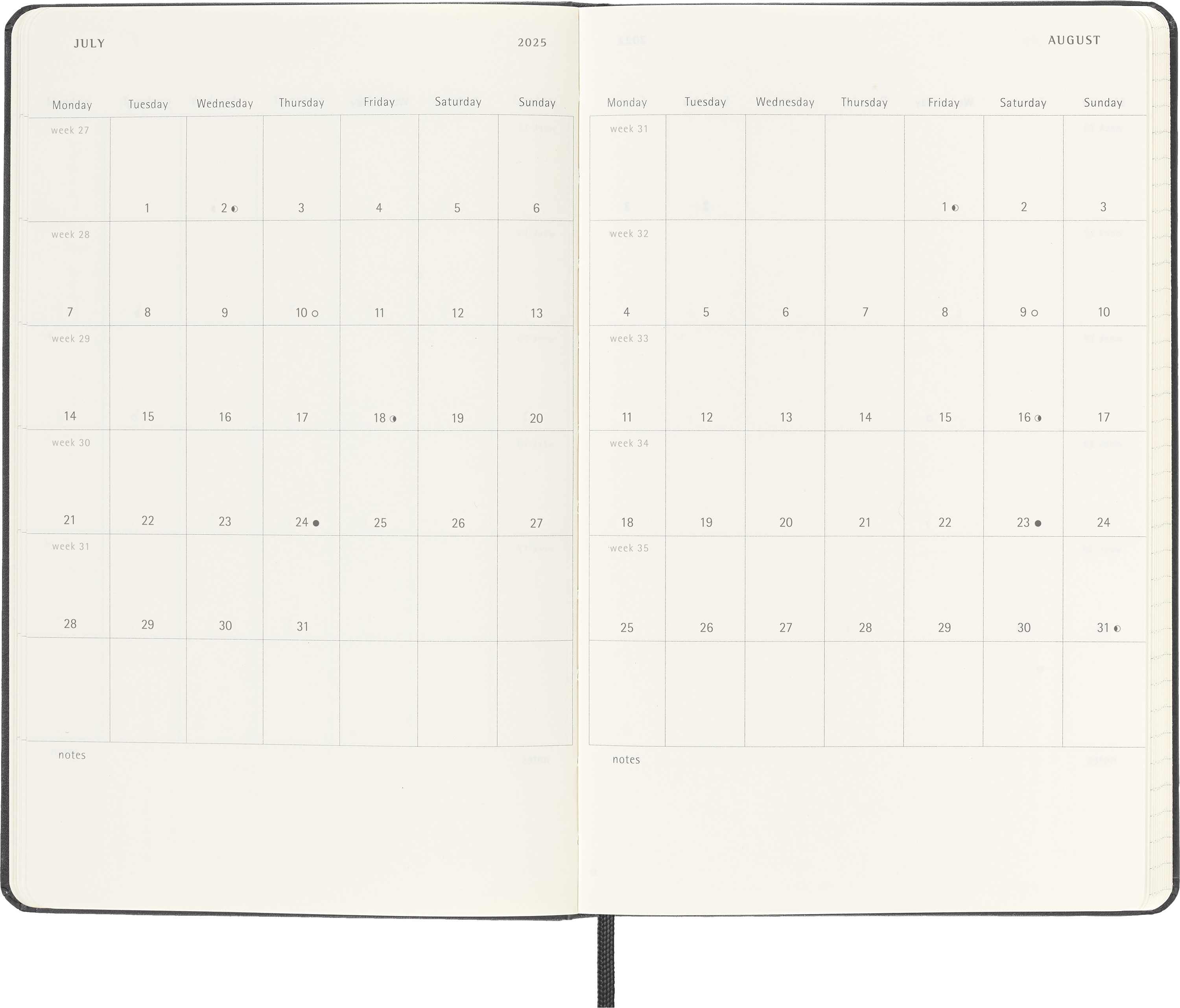 - fester Einband mit abgerundeten Ecken, Gummiband zum Verschliessen und Lesebändchen