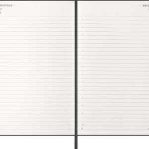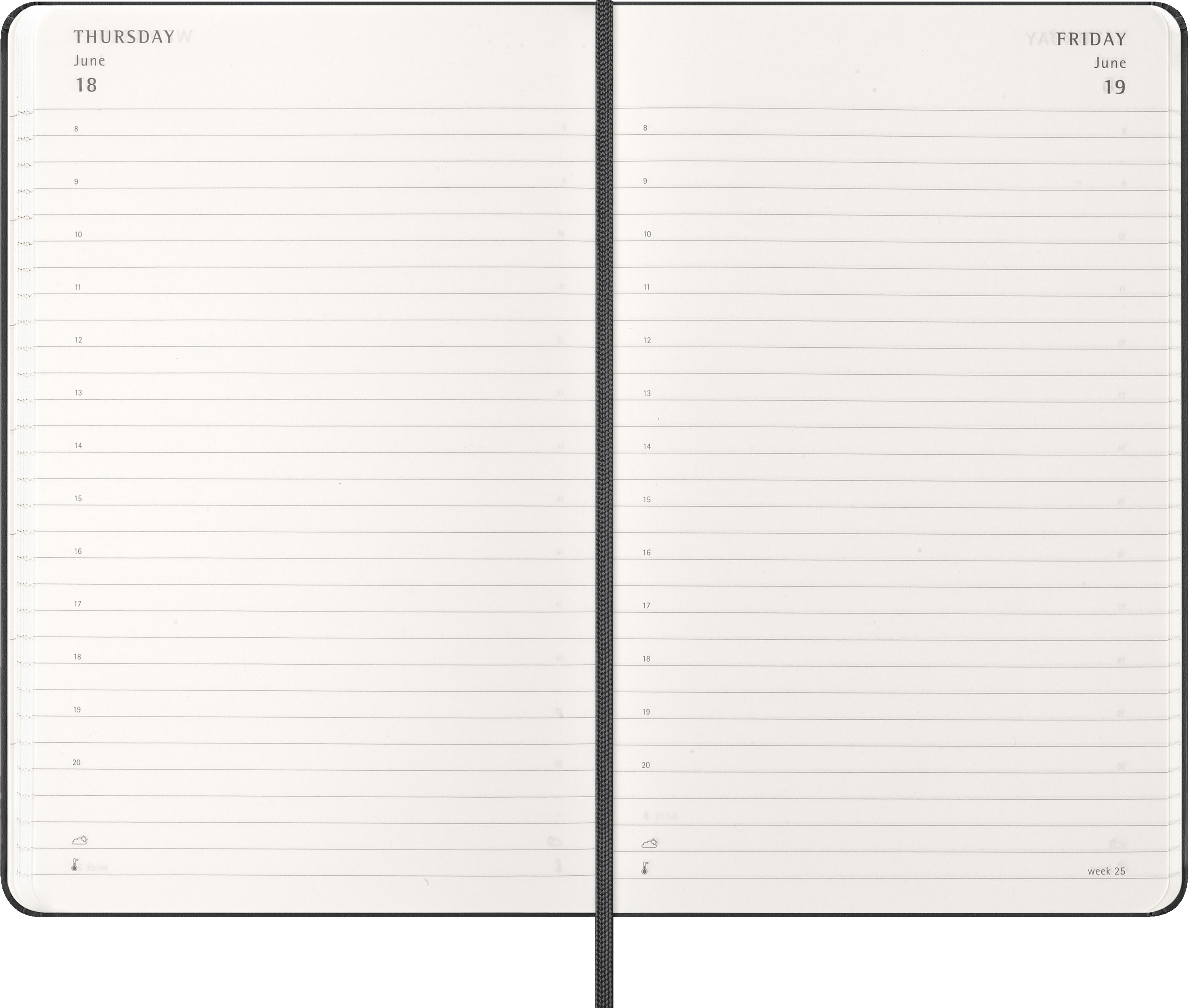 - fester Einband mit abgerundeten Ecken, Gummiband zum Verschliessen und Lesebändchen