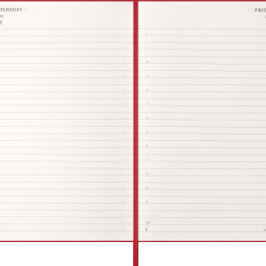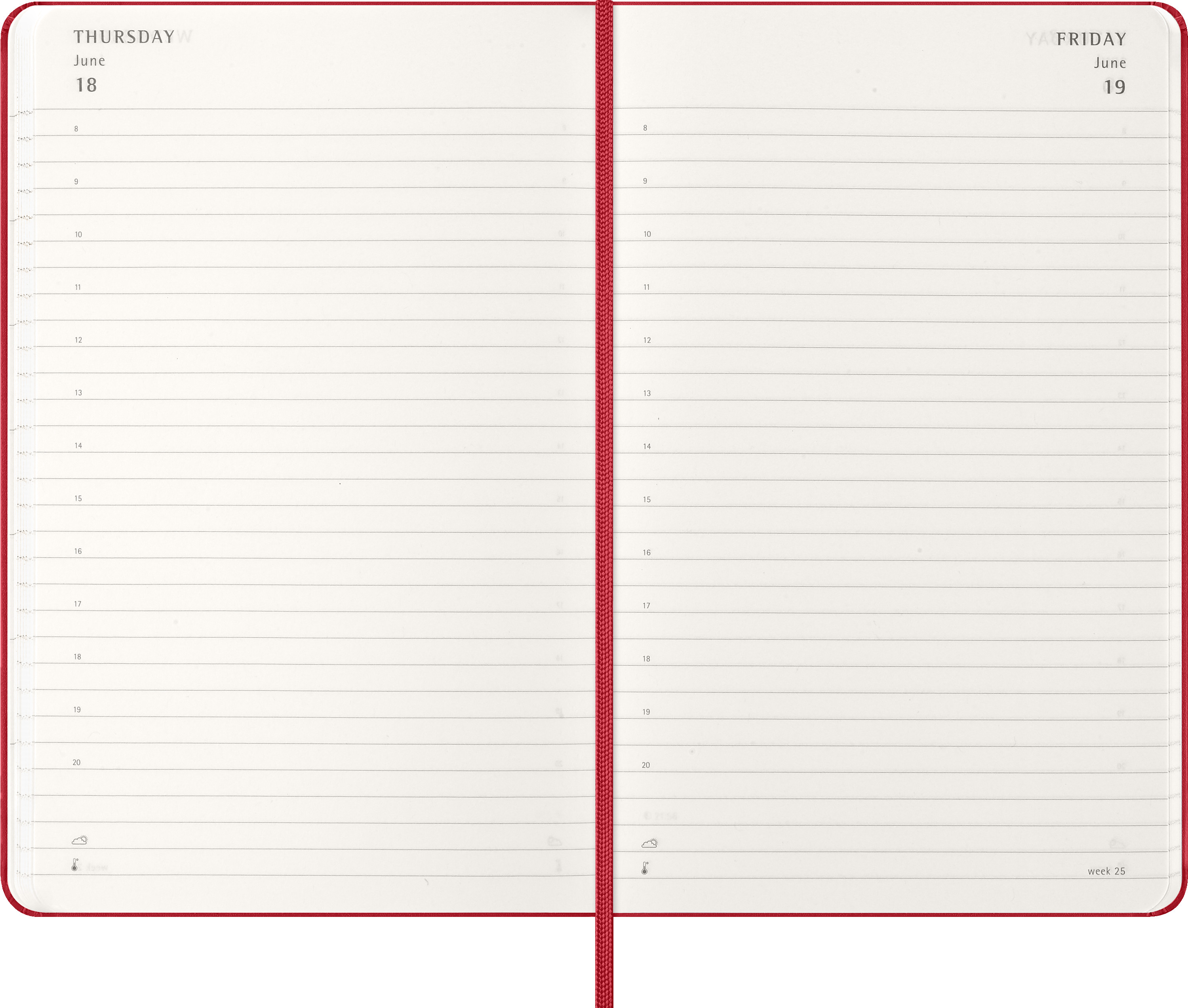 - fester Einband mit abgerundeten Ecken, Gummiband zum Verschliessen und Lesebändchen