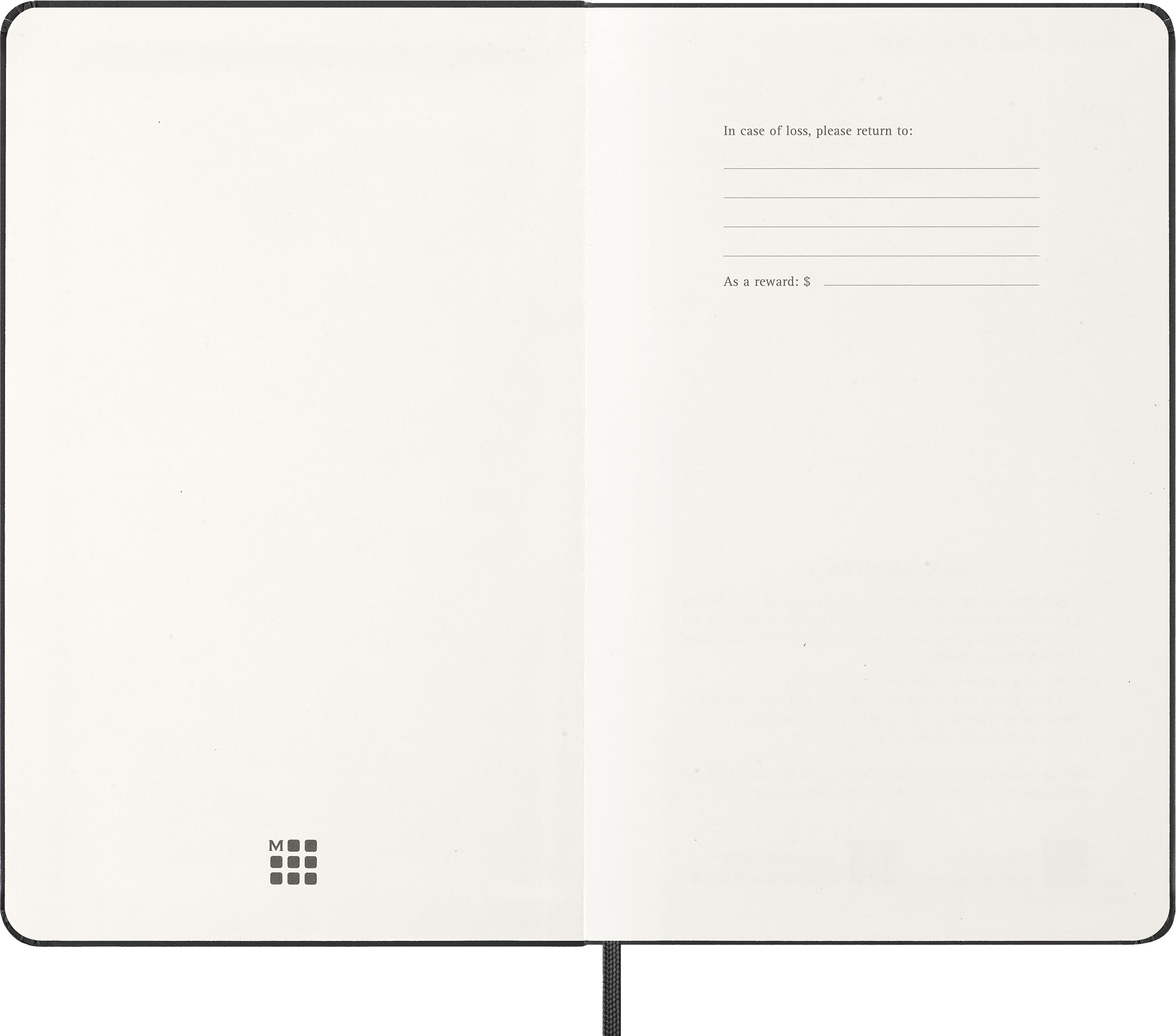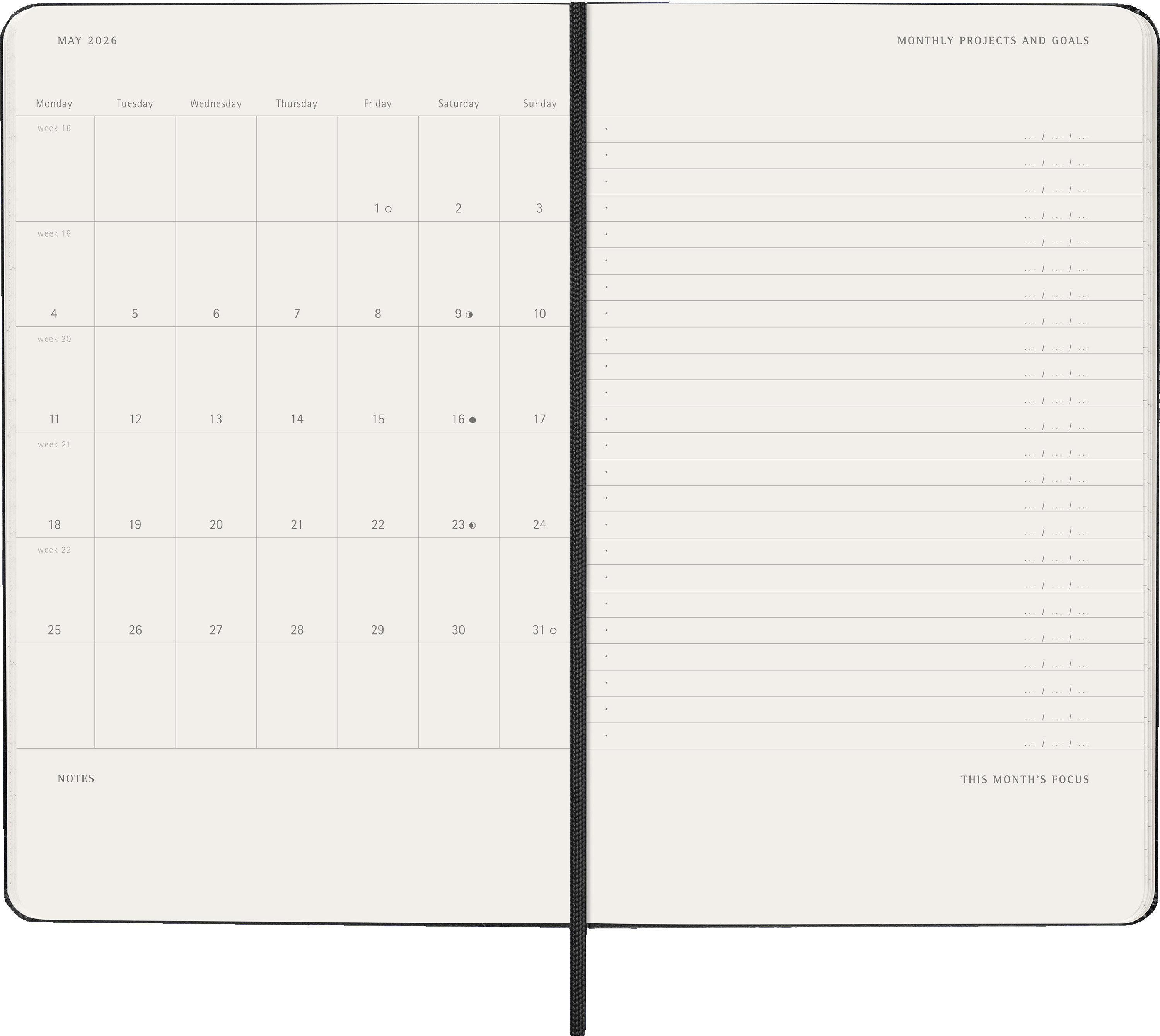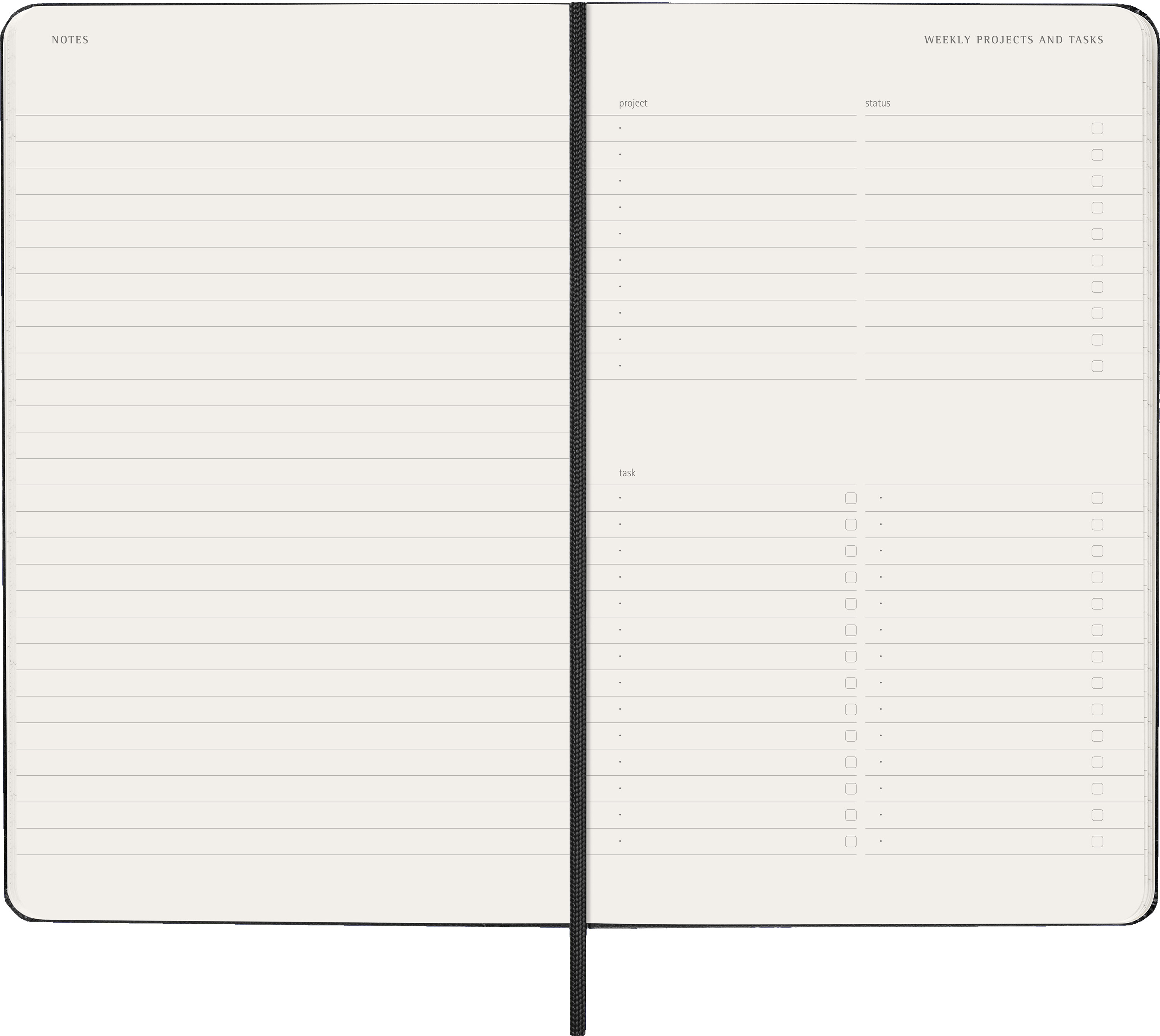 - fester Einband mit abgerundeten Ecken, Gummiband zum Verschliessen und Lesebändchen