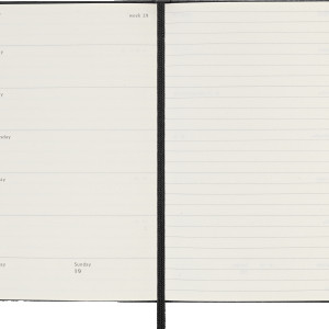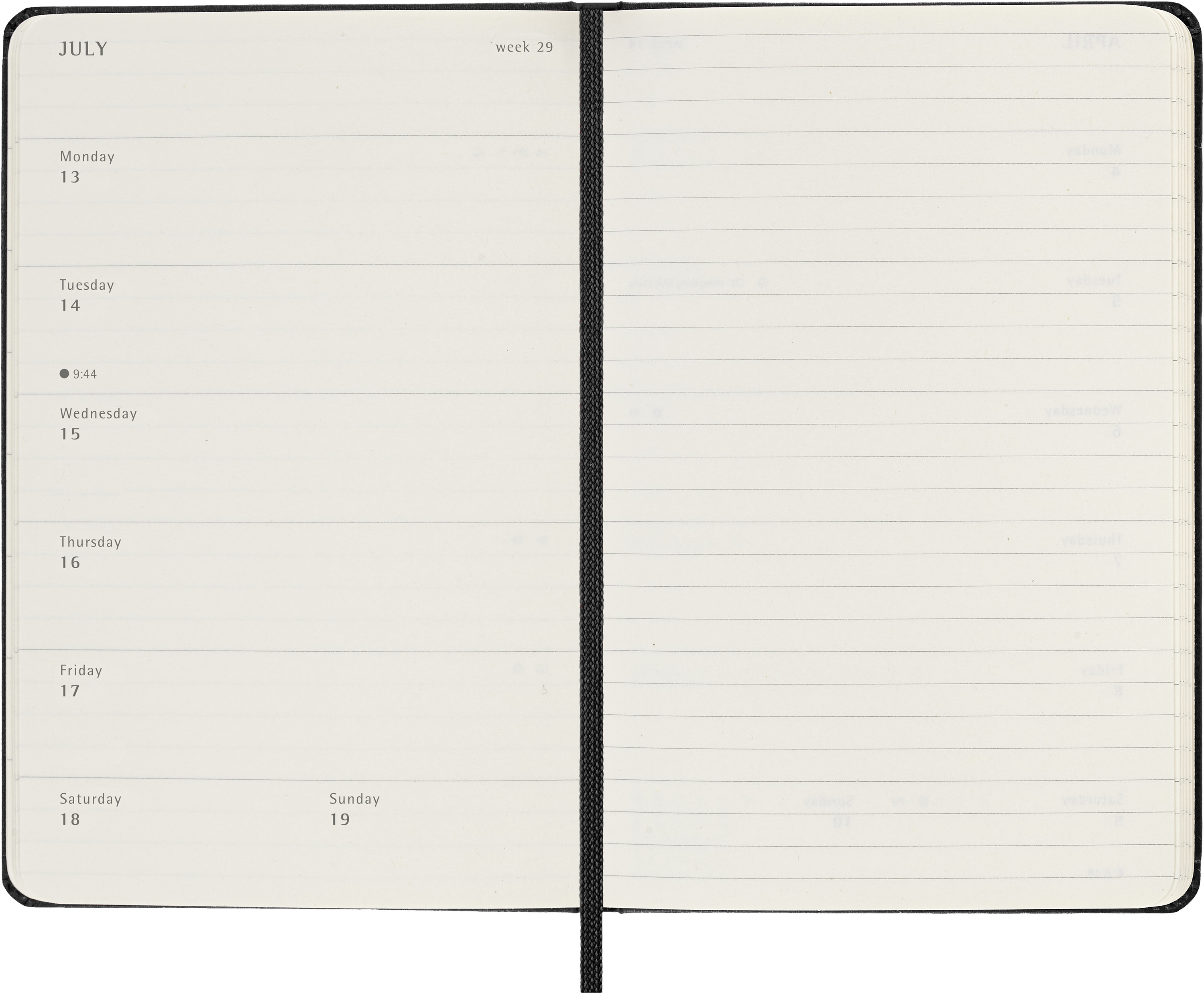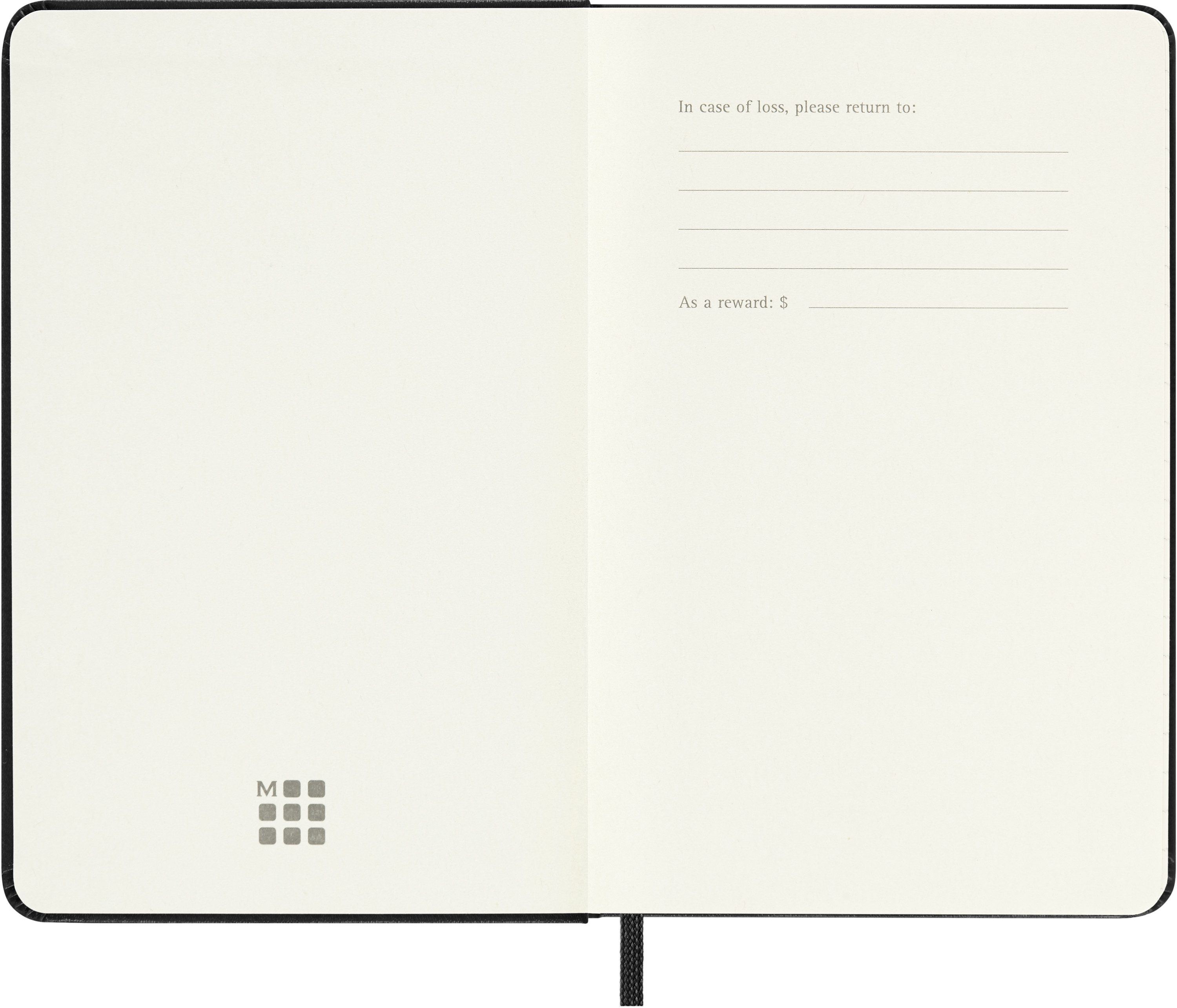 - fester Einband mit abgerundeten Ecken, Gummiband zum Verschliessen und Lesebändchen