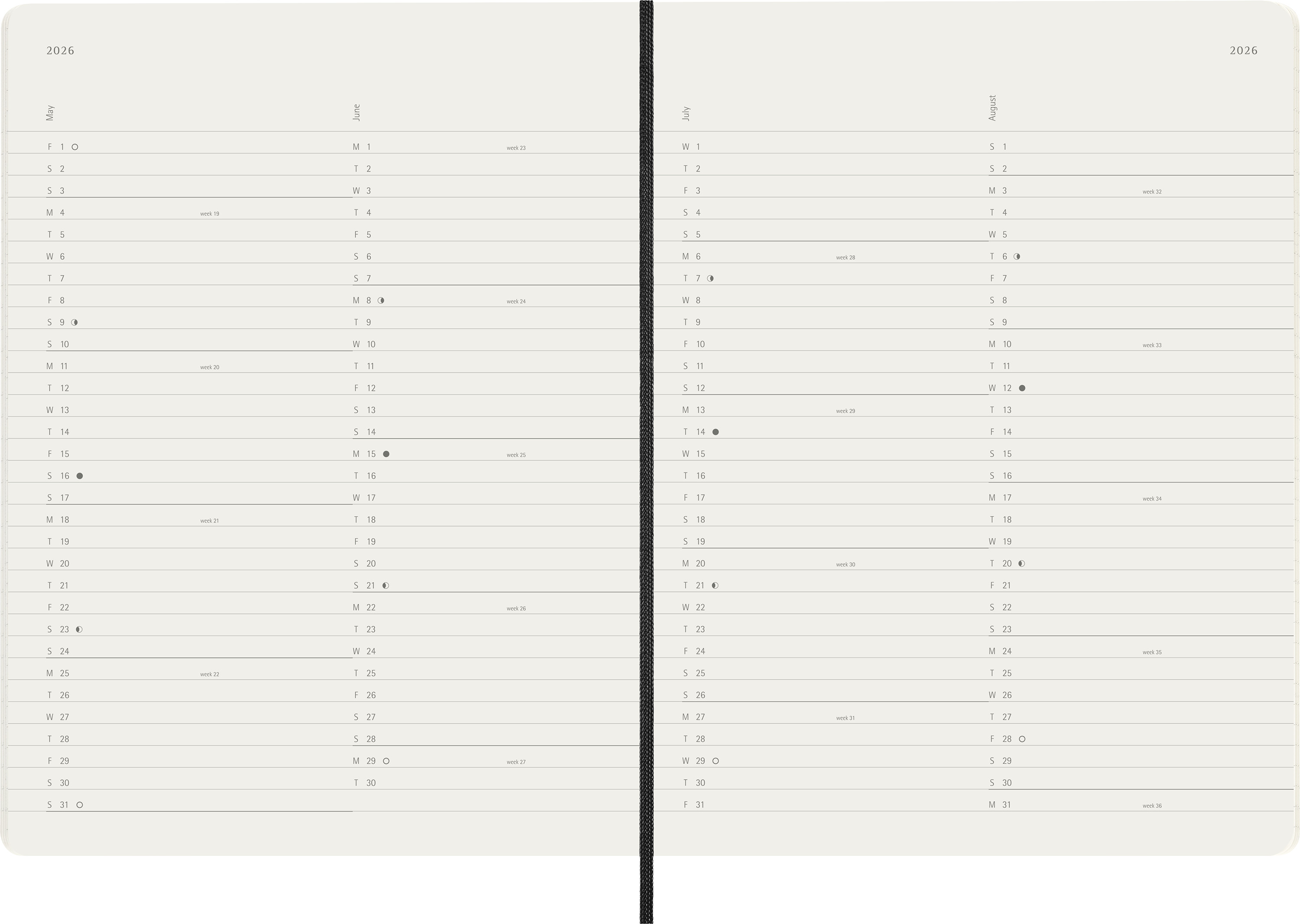 Ganzer Monat auf zwei Seiten, gefolgt von linierten Seiten für Notizen