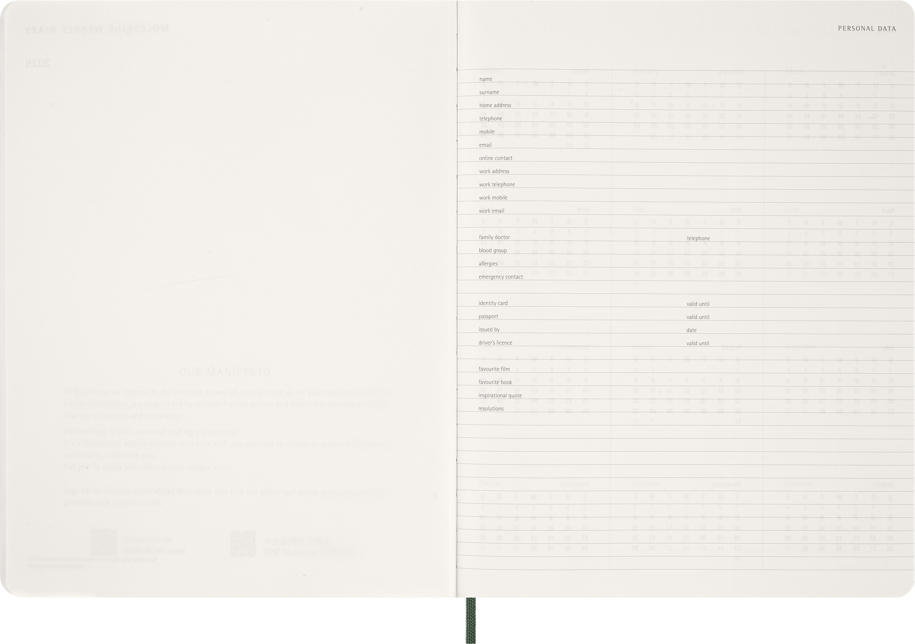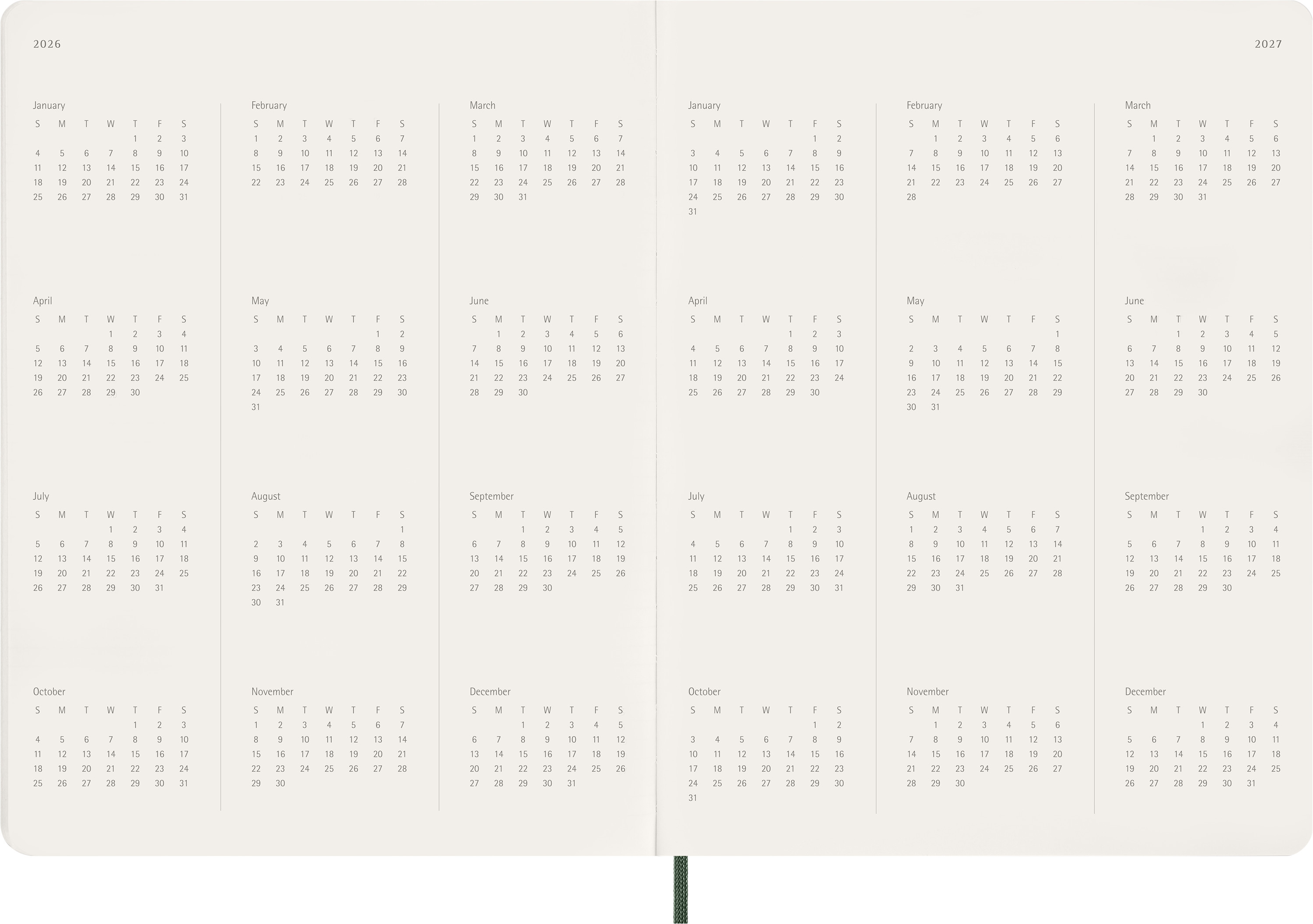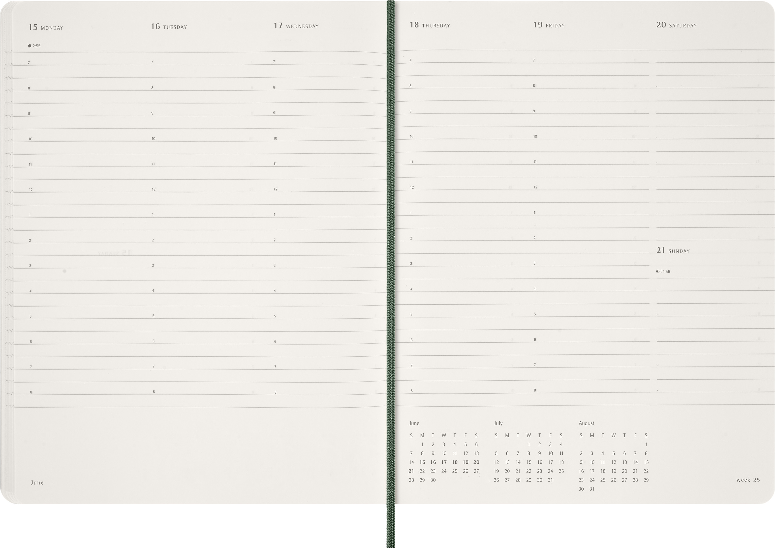 Dieser schlanke und elegante Planer im unverwechselbaren Moleskine-Design hat einen flexiblen und dennoch robusten Einband. Im Inneren ist jede Woche auf zwei Seiten dargestellt. Die Wochentage werden vertikal angezeigt, mit stündlichen Feldern für Ihre Termine von 7 bis 20 Uhr, ausser Samstag und Sonntag, die ohne Zeitangabe sind. Jede Woche enthält ausserdem einen kleinen 3-Monats-Kalender, um Ihrer Planung eine gewisse Perspektive zu geben.