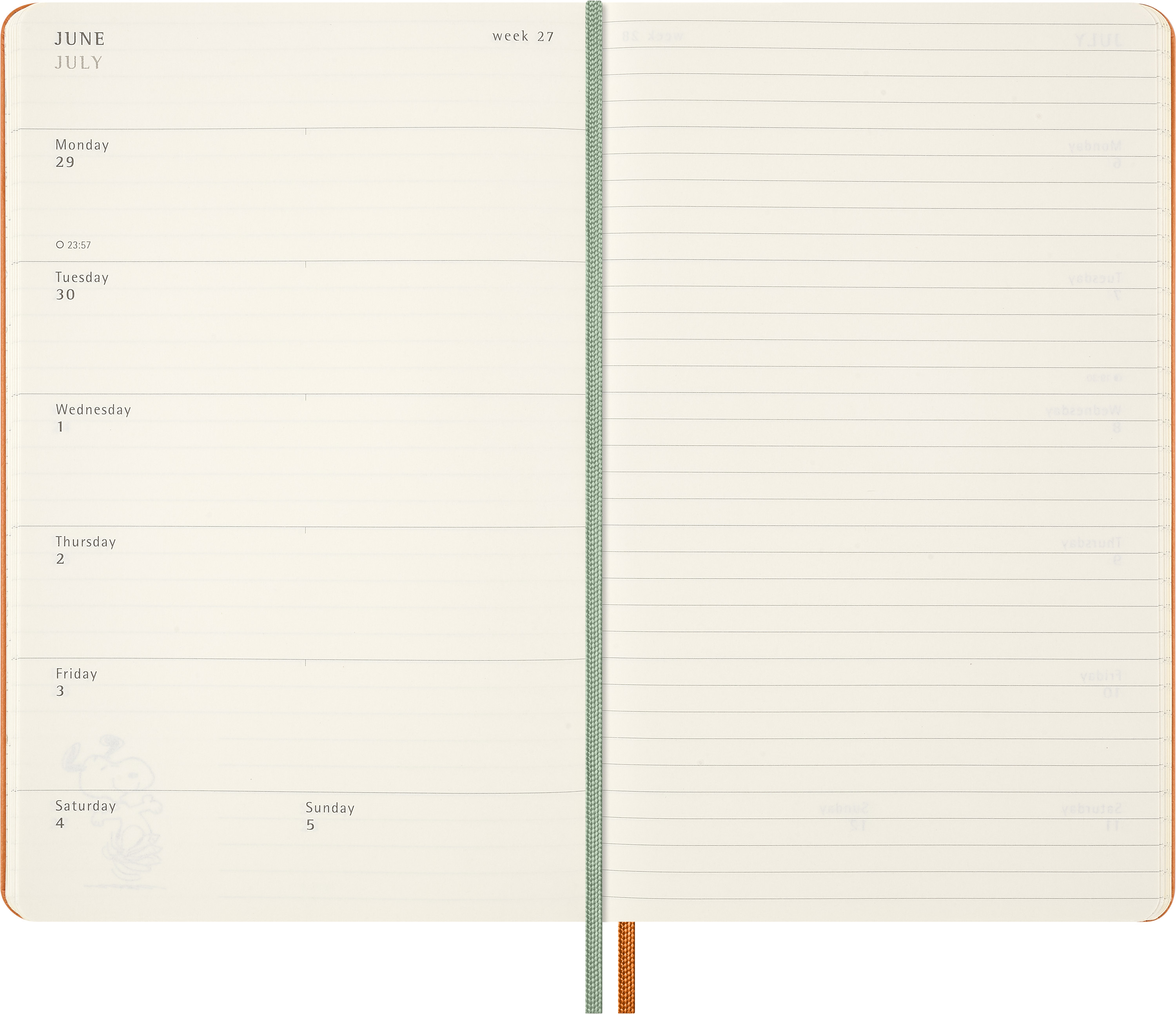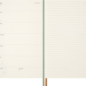 - Auf der linken Seite alle Termine der Woche auf einen Blick, linierte Seiten für Notizen und Ideen auf der rechten Seite