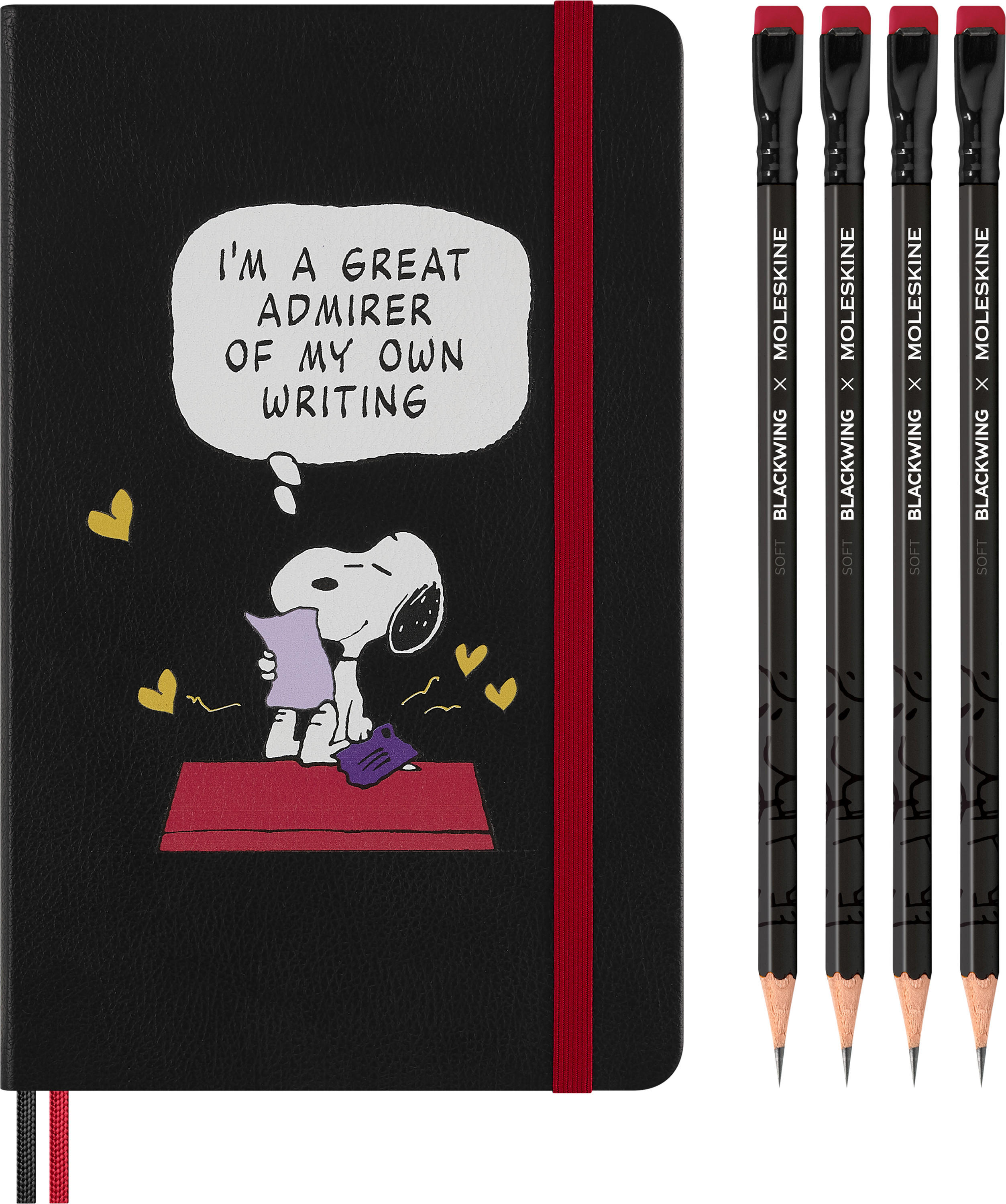 Halten Sie Ihre Gedanken, Ideen und Kritzeleien mit diesem Peanuts Moleskine Notizbuch und Bleistift Set fest – eine Hommage an die einfachen Wahrheiten und die Kraft der Schreibens von Hand. Die Geschenkbox enthält ein liniertes Notizbuch in der Grösse Large (13x21cm) mit kultigen Peanuts Illustrationen, die die Freude am Schreiben hervorheben, sowie 4 Peanuts Bleistifte von Blackwing.