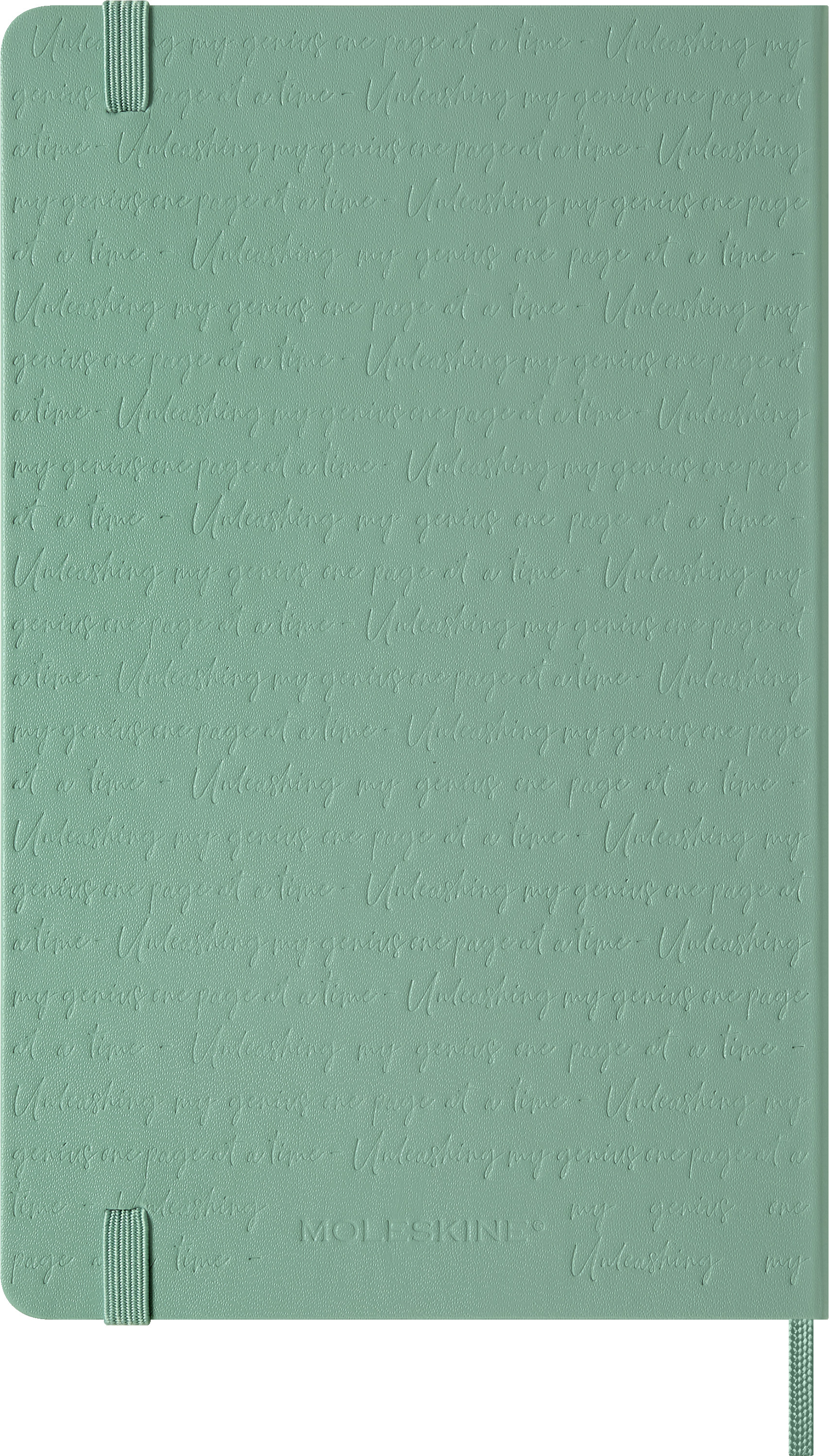 Ton-in-Ton über den Einband geprägt, erinnert der Satz „Unleashing my genius one page at a time“ daran, das eigene Genie Seite für Seite zu entfachen.