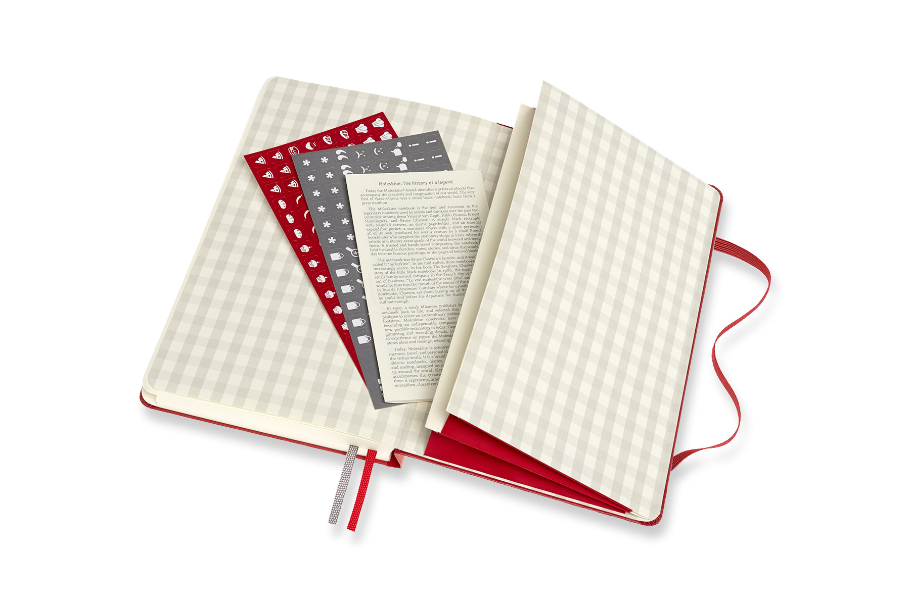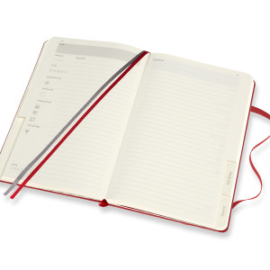 - fester Einband mit themenspezifischer Prägung, abgerundete Ecken, Gummiband zum Verschliessen