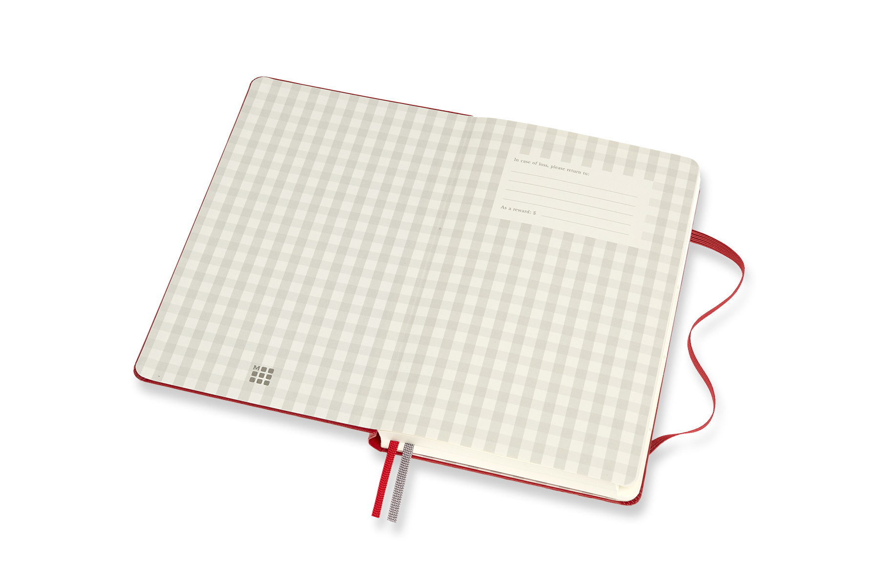 - Vorderes Vorsatzblatt mit „In case of loss“-Hinweis