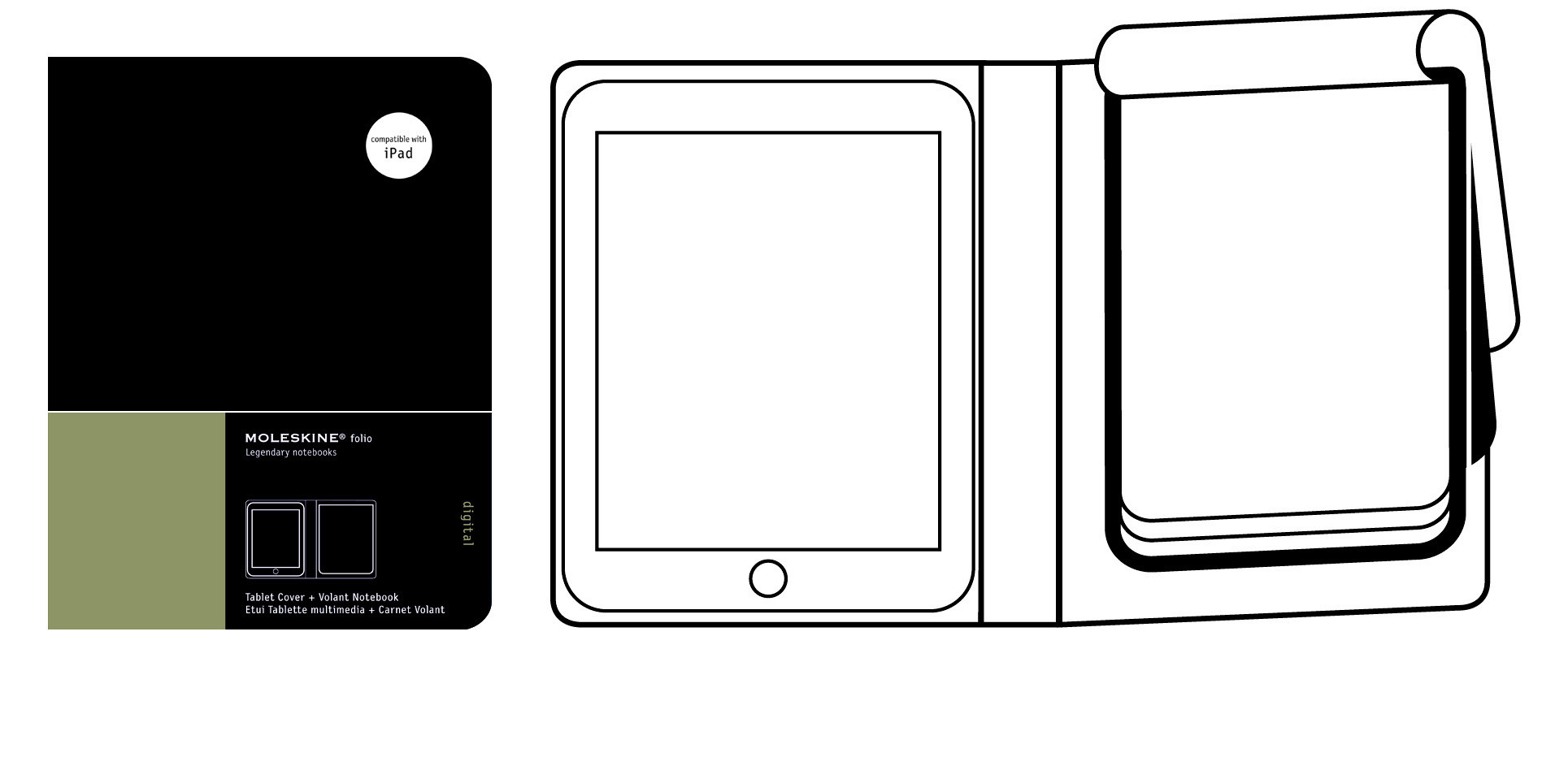 Elegantes Cover für iPad 1. Aussen: Klassisch schwarz, Kunstleder, Gummiband zum Verschliessen. Innen sandfarben, gepolstertes Kunstlederfutter, ein Rahmen hält den iPad auf der linken Seite (mit einer Unterlage im Rücken des iPad2 wird dieser so gehalten wie der iPad1. Anm. der Verlagsvertretung); dazu ein blanko Volant Notizblock mit 96 Seiten (nachfüllbar) auf der rechten Seite.