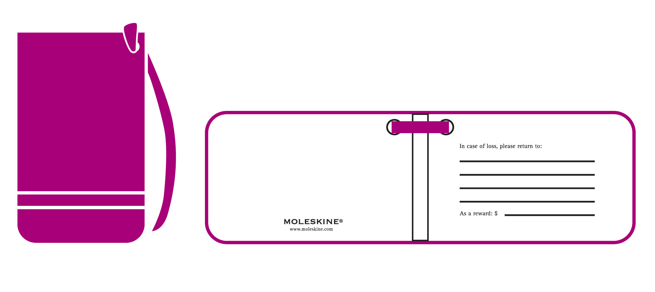 Magentafarbener Gepäckanhänger. Inspiriert vom klassischen Moleskine-Look, mit Platz für Name und Adresse.