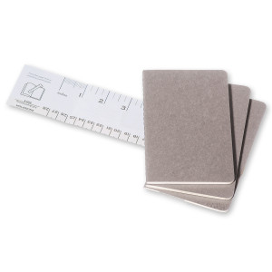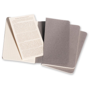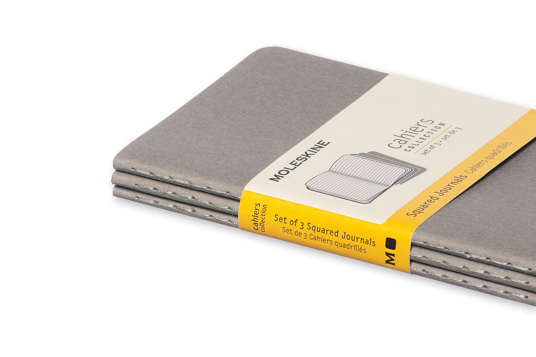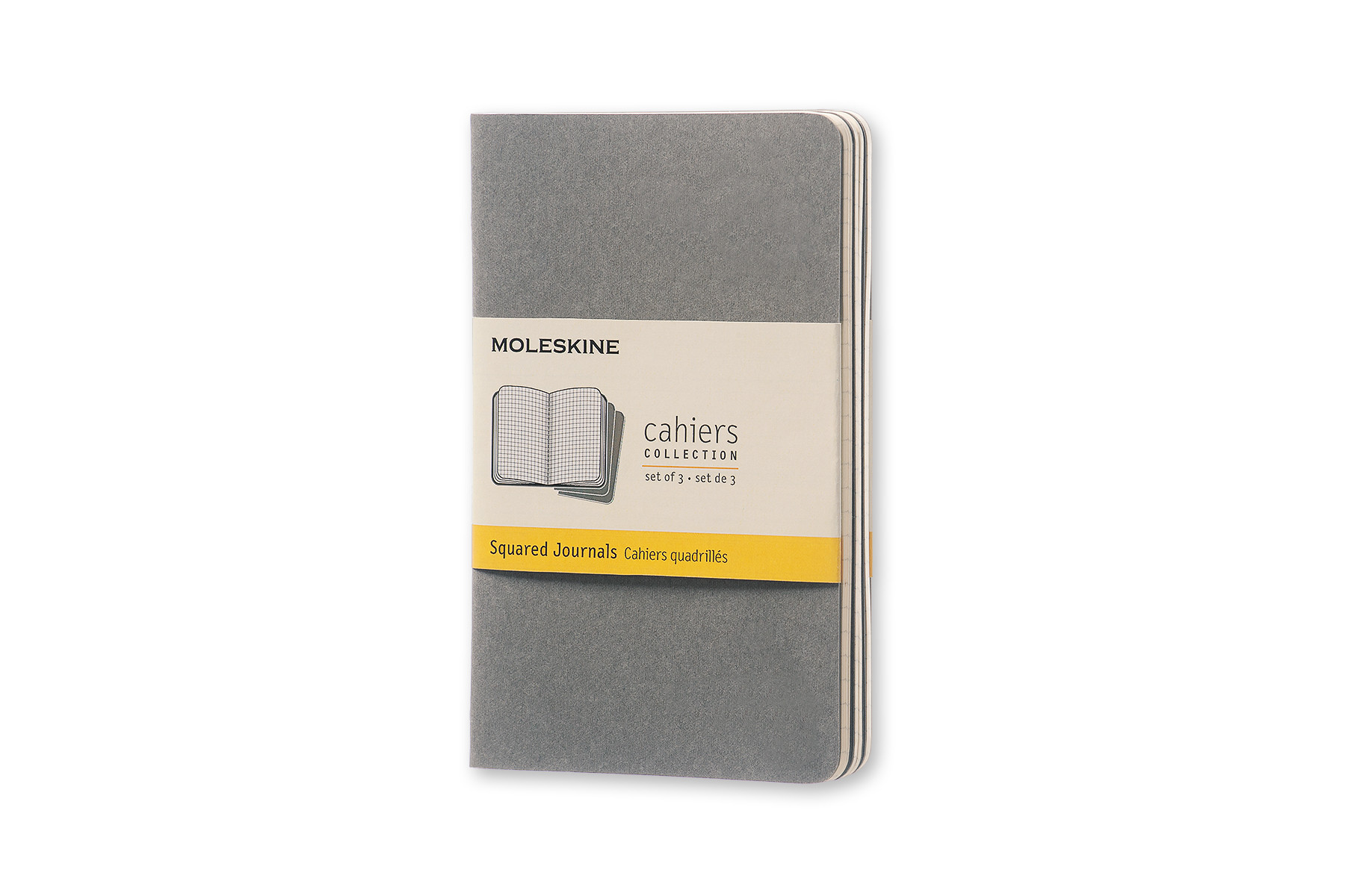 Kariertes Cahier- Notizheft. 3-er Set. Kartoneinband mit sichtbarer Fadenheftung am Rücken. Die letzten 16 Seiten sind heraustrennbar. Mit grosser Innentasche für lose Notizzettel.